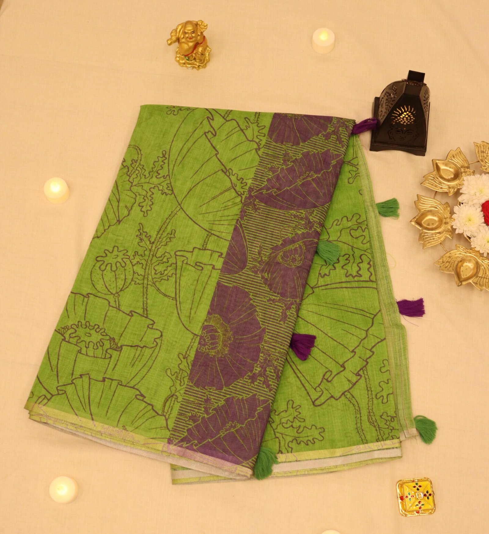 Elegant {Green Violet} cotton saree from Penn_in – soft, breathable, lightweight, and comes with 6.2 m length including blouse piece. Perfect for daily and festive wear.